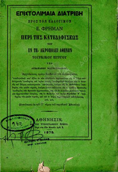 Επιστολιμαία διατριβή προς τον ελλόγιμον Ε. Φρήμαν περί της κατεδαφίσεως του εν τη Ακρόπολει Αθηνών τούρκικου πύργου
