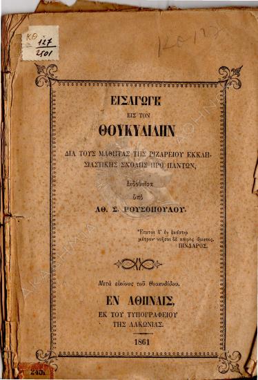 Εισαγωγή εις τον Θουκυδίδην : δια τους μαθητάς της Ριζαρείου Εκκλησιαστικής Σχολής προ πάντων