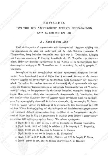 Εκθέσεις των υπό του Λαογραφικού Αρχείου πεπραγμένων κατά τα έτη 1943 και 1944