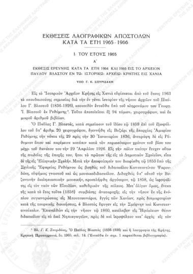 Έκθεσις ερεύνης κατά τα έτη 1964 και 1965 εις το Αρχείον Παύλου Βλαστού εν το Ιστορικό Αρχείο Κρήτης εις Χανιά : Εκθέσεις περί των λαογραφικών αποστολών κατά τα έτη 1965-1966. Ι. Του έτους 1995