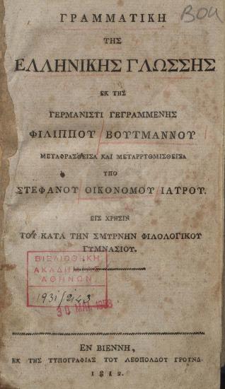 Γραμματική της ελληνικής γλώσσης : εις χρήσιν του κατά την Σμύρνην Φιλολογικού Γυμνασίου
