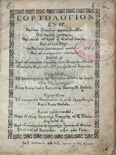 Εορτολόγιον εν ω περί τινων ζητημάτων προλαμβανομένων : Περί ακριβούς χρονολογίας : Περί πασών των εορτών και της αυτών θεωρίας : Περί του Αγίου Πάσχα : Περί τινων εκκλησιαστικών κανονίων...
