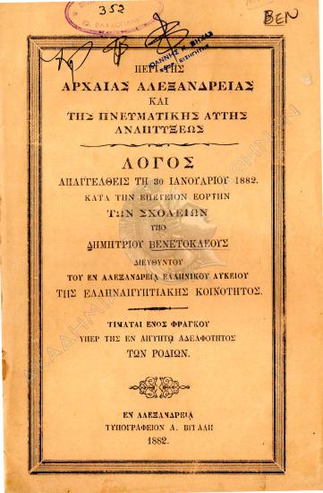 Περί της αρχαίας Αλεξανδρείας και της πνευματικής αυτής αναπτύξεως : λόγος απαγγελθείς τη 30 Ιανουαρίου 1882 κατά την επέτειον εορτήν των σχολείων