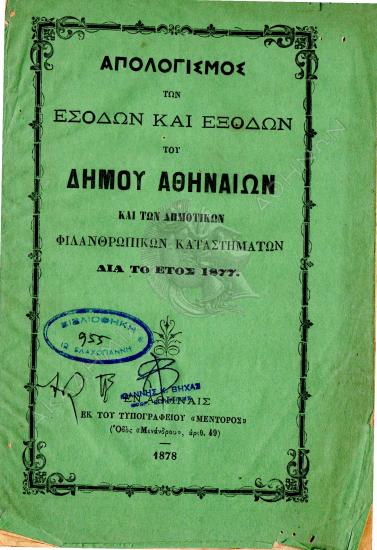 Έκθεσις του Δημάρχου Αθηναίων επί των λογαριασμών της εν γένει Δημοτ. διαχειρίσεως του έτους 1877