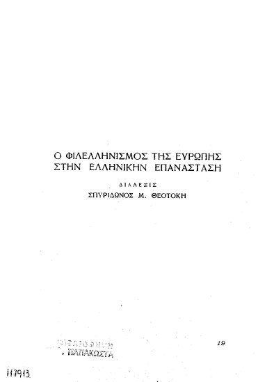 Ο Φιλελληνισμός της Ευρώπης στην Ελληνικήν Επανάσταση / Διάλεξις Σπυρίδωνος Μ. Θεοτόκη.