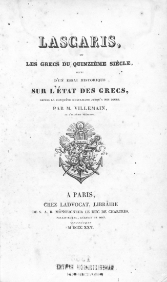 Lascaris : Οu les Grecs du quinzieme siecle, suivi d'un essai historique sur l'etat des Grecs, depuis la conquete musulmane jusqu'a nos jours / par M. Villemain ___.