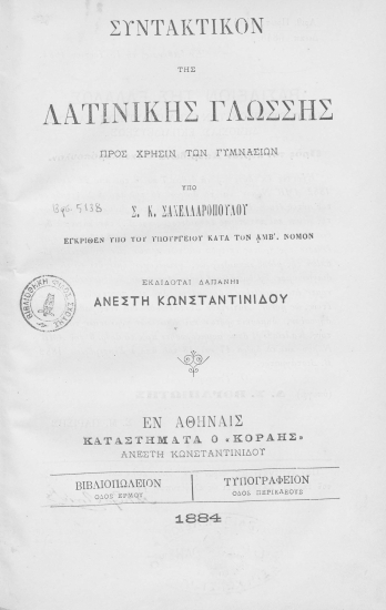 Συντακτικόν της λατινικής γλώσσης : προς χρήσιν των γυμνασίων / υπό Σ. Κ. Σακελλαρόπουλου ___.