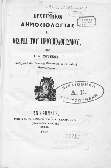 Εγχειρίδιον δημοσιολογίας : ή θεωρία του προϋπολογισμού / υπό Ι. Α. Σούτσου ___.