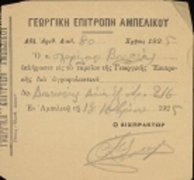 Απόδειξη πληρωμής Χαρίλαου Βουλαλά προς ταμείο Γεωργικής Επιτροπής (1925)