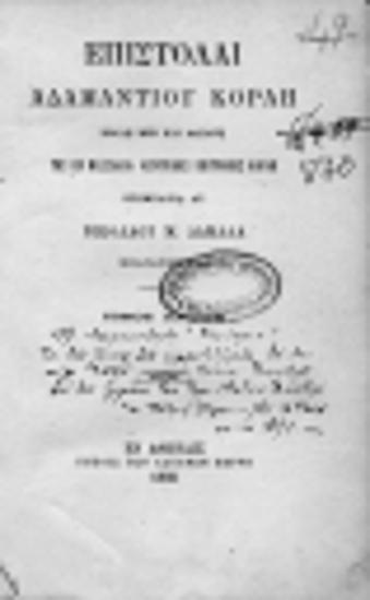 Επιστολαί Αδαμάντιου Κοραή, βουλή μεν και δαπάνη της εν Μασσαλία Κεντρικής Επιτροπής Κοραή επιμέλεια δε Νικολάου Μ. Δαμαλά