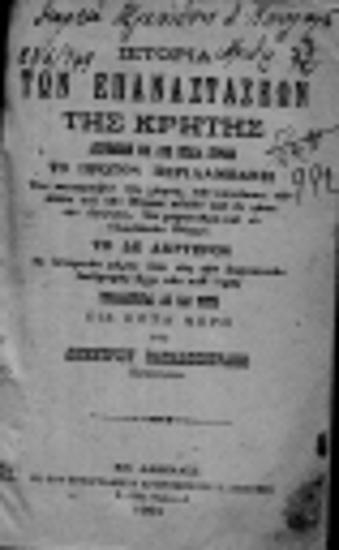 Ιστορία των επαναστάσεων της Κρήτης, διηρημένη εις δύο βιβλία κυρίως το πρώτον περιλαμβάνει την περιγραφήν της χώρας, των κατοίκων,των ηθών κα των εθίμων αυτών και εν γένει την αγωγήν, τον χαρακτήρα και το γλωσσικόν ιδίωμα,το δε δεύτερον το ιστορικόν μέρος από της των Σαρακηνών επιδρομής άχρι των καθ' ημάς,υποδιαιρείται δε και τούτο εις επτά μέρη