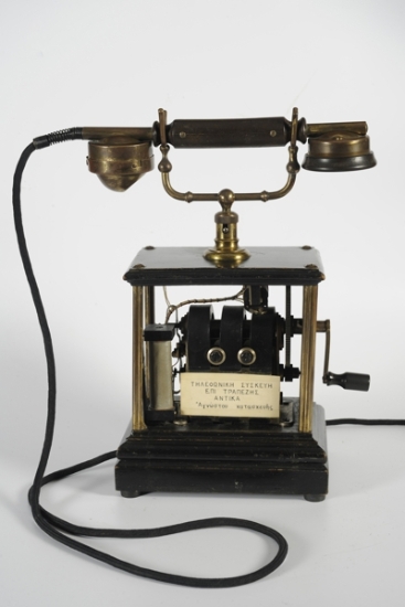 Μαγνητική τηλεφωνική επιτραπέζια συσκευή με βάση από ξύλο, μεταλλικά μέρη, μανιβέλλα στο δεξί μέρος του κιβωτίου. Στο επάνω μέρος υπάρχει η υποδοχή του ακουστικού. Το ακουστικό είναι μεταλλικό και έχει επένδυση βακελίτη στη λαβή και στο δέκτη