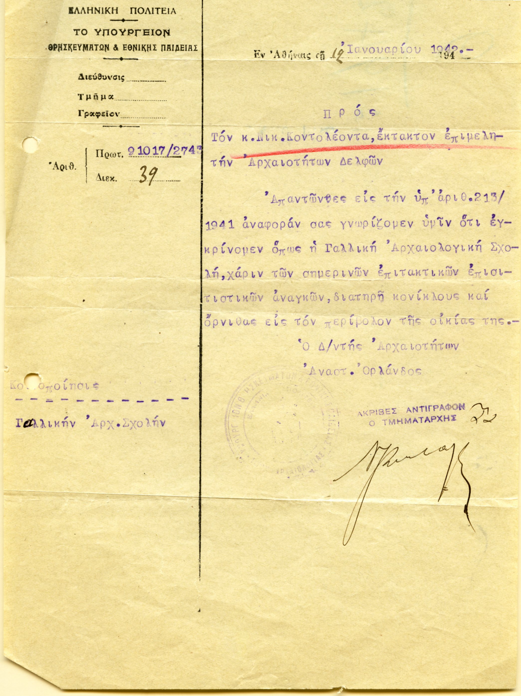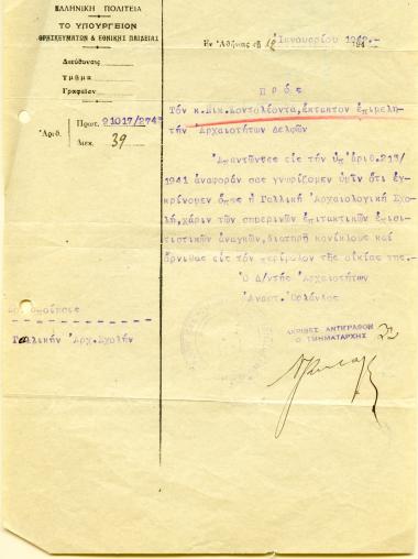 Επιστολή προς το Υπουργείο για τις επισιτιστικές ανάγκες της Γαλλικής Αποστολής