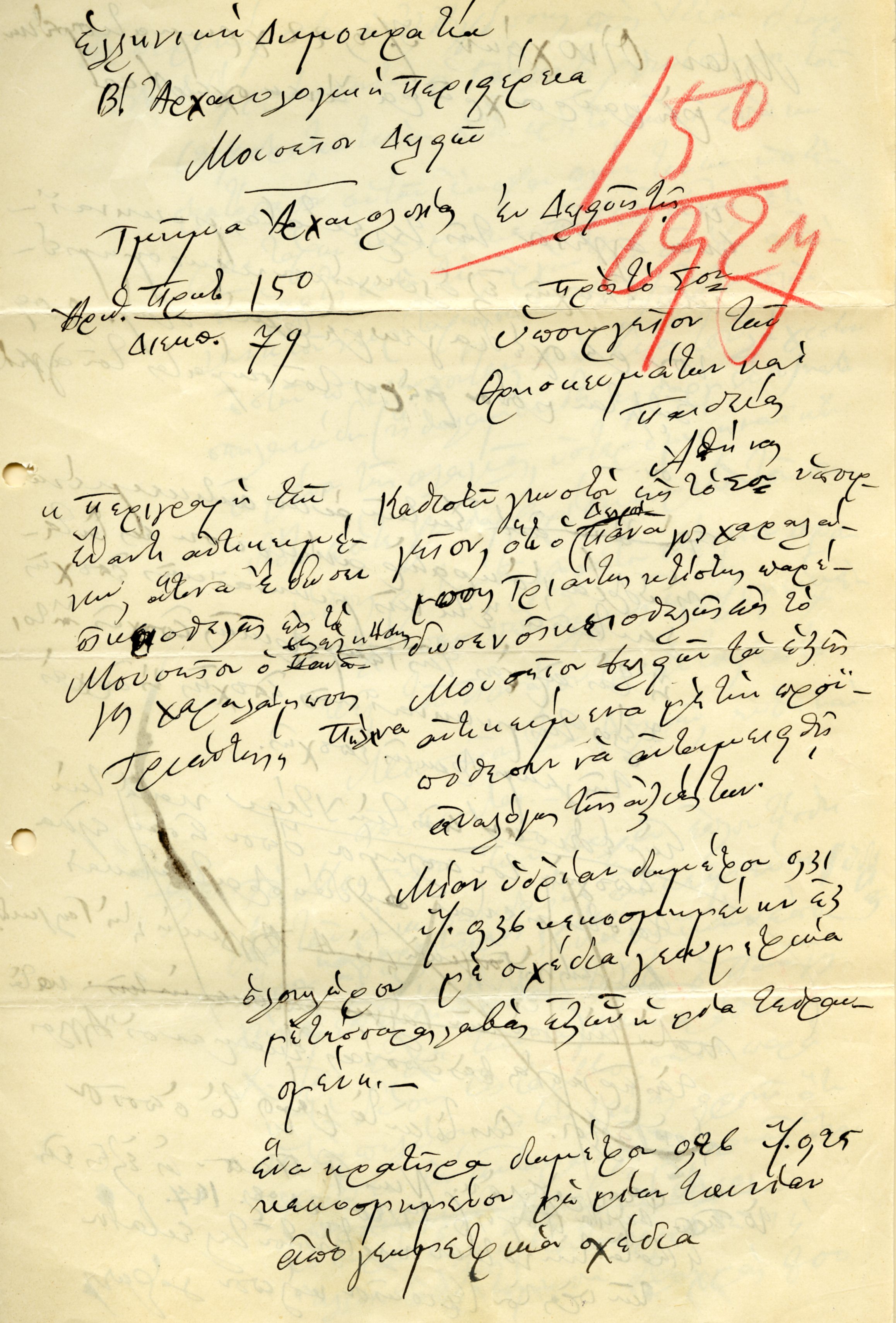 Letter by the curator of antiquities of Delphi to the Ministry of Education and Religion dated to 1927, which contains a list of items delivered to the museum by the mason Pan. Ch. Triantes, under the condition of receiving a fee.