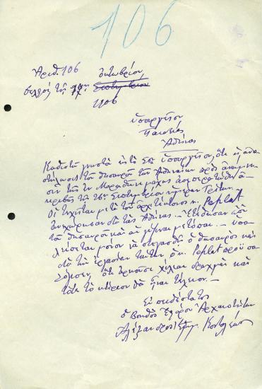 Επιστολή του Α. Κοντολέοντος για την ολοκλήρωση της αναστήλωσης του Θησαυρού των Αθηναίων.