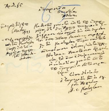 Χειρόγραφη επιστολή του Εφόρου Αρχαιοτήτων Δελφών Α.Ε.Κοντολέοντος προς το υπουργείο Παιδείας με το οποίο κοινοποιείται η επιθυμία του Άγγελου Σικελιανού να περιφράξει με δικά του έξοδα την Κασταλία πηγή (1923).