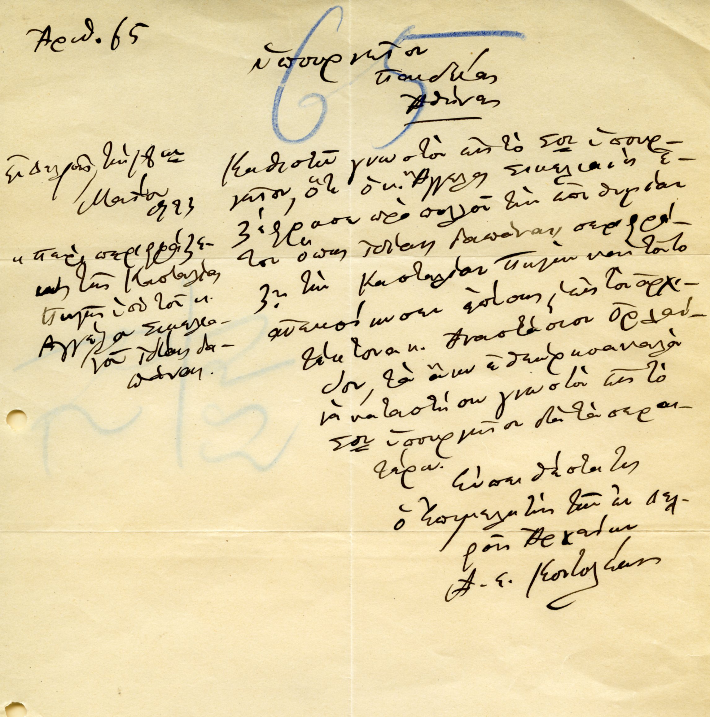 Χειρόγραφη επιστολή του Α.Ε.Κοντολέοντος προς το υπουργείο Παιδείας για την πρόθεση του Σικελιανού να περιφράξει την Κασταλία (1923).