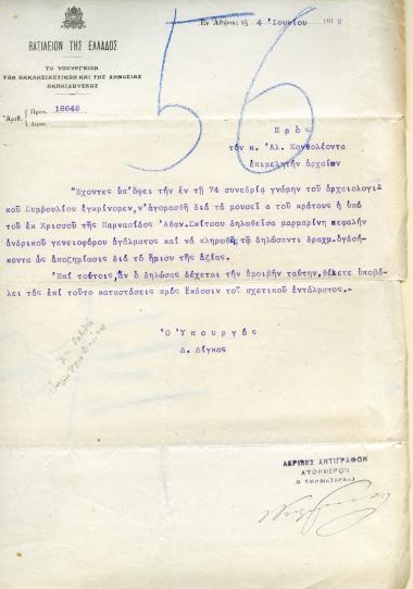 Letter of the Minister of Ecclesiastic Affais and Public Education dated June 4th 1919, with which the Curato of Antiquities of Delphi mr. Kondoleon is ordered to remunerate Athan. Skitsos from Chrisso with 80 drachmas for having given up to the authorities a marble head of a bearded man, which he had discovered fortuitously.
