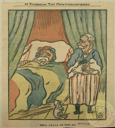 "Η Υποβολή του Προϋπολογισμού". Γελοιογραφία της εφημερίδας "Χρόνος". 06/12/1909