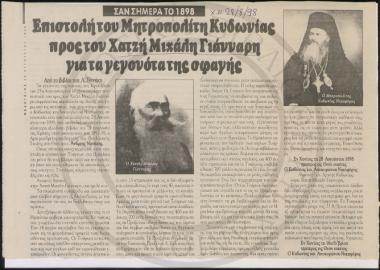 Επιστολή του Μητροπολίτη Κυδωνίας προς τον Χατζή Μιχάλη Γιάνναρη για τα γεγονότα της σφαγής