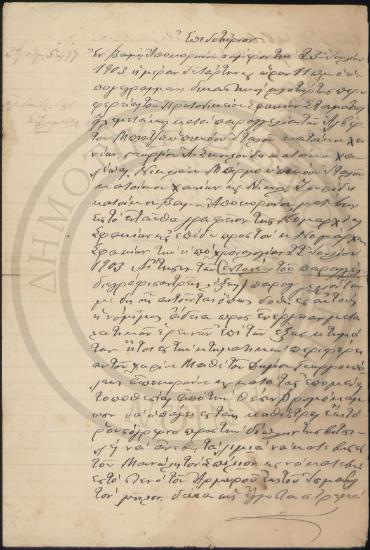 Νομικό έγγραφο (επιδοτήριο) με το οποίο πιστοποιείται η επίδοση στον νομάρχη Σφακίων αίτησης με την οποία ζητείται η άδεια διενέργειας μεταλλευτικών ερευνών στην περιοχή του χωριού Μαθές Αποκορώνου.