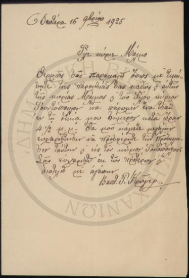 Πρόσκληση της Βαπτιστίνης Κρύγερ (Κρούγερ) προς τον Αντώνιο Μάλμο για τσάι. Στην πρόσκληση γίενται παράκληση προς τον Μάλμο να παρεβρεθεί μαζί με τον "κύριον Φουντόπουλον" πιθανότατα τον Απόστολο Φουντόπουλο.