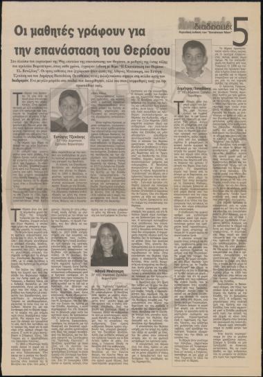 Απόκομμα της εφημερίδας "Χανιώτικα Νέα", όπου παρατίθενται κείμενα μαθητών της Στ' τάξης του Δημοτικού Σχολείου Βαρυπέτρου για το Κίνημα στο Θέρισο. (EL)