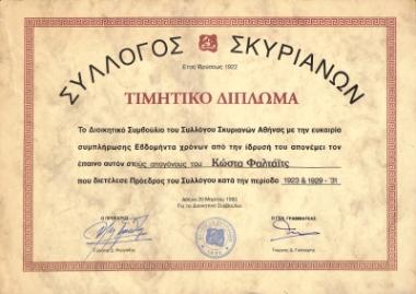 ΤΙΜΗΤΙΚΟ ΔΙΠΛΩΜΑ ΣΤΟΥΣ ΑΠΟΓΟΝΟΥΣ ΤΟΥ ΚΩΣΤΑ ΦΑΛΤΑΙΤΣ