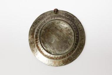 Χάλκινο πιάτο κανονικού μεγέθους, με εμπίεστη διακόσμηση. Τοποθετούνται στον τοίχο ανάποδα, τα σφυρήλατα κάτω από το καλό ράφι.\nΒιβλιογραφία: Φαλτάιτς Μάνος Κ., «Η “αλώνη” του σκυριανού σπιτιού (διακοσμητικά αντικείμενα)». Ελληνική Λαϊκή Τέχνη, 8 (1972), σ. 146-155. \nΦαλτάιτς Μάνος Κ., Τα διακοσμητικά αντικείμενα του σκυριανού σπιτιού από ιστορική και κοινωνιολογική άποψη. Έκδοση του περιοδικού “συλλογές” σε συνεργασία με το Μουσείο Φαλτάιτς, Αθήνα 1986 (= Αρχείον Ευβοϊκών Μελετών 19 (1974), σ. 59-96). (EL)