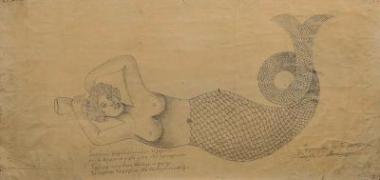 Μία γοργόνα. Γράφει ο καλλιτέχνης: \"Γοργόνα μου τραγούδισε να κούσω τη λαλιά σου σαν το δελφίνι να ριχτό μέσα στην αγκαλιά σου. Γοργόνα μ' υπερήφανη βοήθα με να ψαρέψω, τα κάλη σου ταγκελικά στα δοίχτια μου να μπλέξω.\" Το υπογράφει (EL)