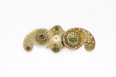 Σφυρήλατα γυναικεία αμυγδαλωτά κλειδωτήρια με ημιπολύτιμους λίθους.\nΒιβλιογραφία: Αντζουλάτου-Ρετσίλα Ευρυδίκη, «Η φροντίδα για το σώμα του νεογέννητου παιδιού: Η περίπτωση του σκυριανού παιδικού τσεμπεριού». Αρχείον ΕυβοΪκών Μελετών, 26 (1985), σ. 125-142. - Λάμπρου Αλίκη, Οι σκυριανές φορεσιές. Έκδοση Πελοποννησιακού Λαογραφικού Ιδρύματος, Ναύπλιο 1994. - Φαλτάιτς Αναστασία, Τα σκυριανά τσεμπεράκια των συλλογών του Μουσείου Φαλτάιτς. Έκδοση του περιοδικού “συλλογές” σε συνεργασία με το Μουσείο Φαλτάιτς, Αθήνα 1985. - Φαλτάιτς Μάνος Κ., Οι Σκυριανές φορεσιές από κοινωνιολογική άποψη. Α΄ Ανδρικές φορεσιές. Έκδοση Ιστορικής και Λαογραφικής Εταιρείας Σκύρου, Αθήνα 1973.