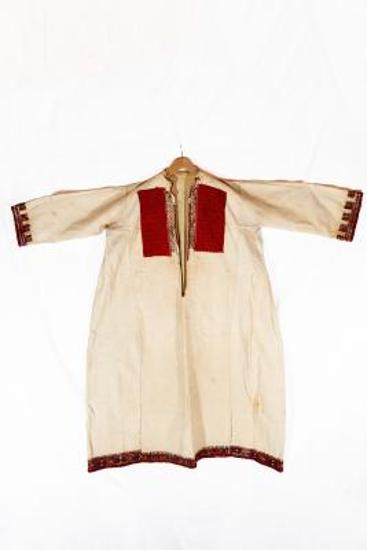 Γυναικείο μανικωτό μακρύ πουκάμισο με γιακά και βαθύ άνοιγμα μπροστά. Στις άκρες των μανικιών και τον ποδόγυρο υπάρχουν κεντημένα γεωμετρικά μοτίβα με κόκκινο γέμισμα. Στον τράχηλο ο κεντητός διάκοσμος είναι πιο αραιός, ενώ υπάρχουν επίρραπτα ορθογώνια κόκκινα κομμάτια από ύφασμα για στολισμό.