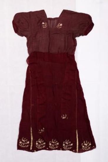 Φόρεμα με κοντά μανίκια και κεντημένο τράχηλο με ΄΄γερτό κλαδί΄΄. Στη μέση ζώνη από το ίδιο ύφασμα, με κεντημένο ΄΄γερτό κλαδί΄΄ στα δύο άκρα. Οι ενώσεις της φούστας είναι με αρατζδέλα. Στον ποδόγυρο υπάρχουν πέντε γερτά κλαδιά, κεντημένα με χρυσοκλωστή, όπως και τα υπόλοιπα.\nΒιβλιογραφία: Αντζουλάτου-Ρετσίλα Ευρυδίκη, «Η φροντίδα για το σώμα του νεογέννητου παιδιού: Η περίπτωση του σκυριανού παιδικού τσεμπεριού». Αρχείον ΕυβοΪκών Μελετών, 26 (1985), σ. 125-142. - Λάμπρου Αλίκη, Οι σκυριανές φορεσιές. Έκδοση Πελοποννησιακού Λαογραφικού Ιδρύματος, Ναύπλιο 1994. - Φαλτάιτς Αναστασία, Τα σκυριανά τσεμπεράκια των συλλογών του Μουσείου Φαλτάιτς. Έκδοση του περιοδικού “συλλογές” σε συνεργασία με το Μουσείο Φαλτάιτς, Αθήνα 1985. - Φαλτάιτς Μάνος Κ., Οι Σκυριανές φορεσιές από κοινωνιολογική άποψη. Α΄ Ανδρικές φορεσιές. Έκδοση Ιστορικής και Λαογραφικής Εταιρείας Σκύρου, Αθήνα 1973.