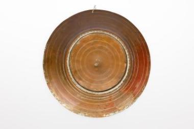 Χάλκινο πιάτο κανονικού μεγέθους, με εμπίεστη διακόσμηση. Τοποθετούνται στον τοίχο ανάποδα, τα σφυρήλατα κάτω από το καλό ράφι.\nΒιβλιογραφία: Φαλτάιτς Μάνος Κ., «Η “αλώνη” του σκυριανού σπιτιού (διακοσμητικά αντικείμενα)». Ελληνική Λαϊκή Τέχνη, 8 (1972), σ. 146-155. \nΦαλτάιτς Μάνος Κ., Τα διακοσμητικά αντικείμενα του σκυριανού σπιτιού από ιστορική και κοινωνιολογική άποψη. Έκδοση του περιοδικού “συλλογές” σε συνεργασία με το Μουσείο Φαλτάιτς, Αθήνα 1986 (= Αρχείον Ευβοϊκών Μελετών 19 (1974), σ. 59-96).