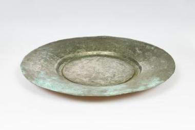 Μεγάλη χάλκινη πιατέλα χωρίς διακόσμηση εσωτερικά. Πιθανόν τουρκικής ή αραβικής προέλευσης. Μπαίνει, όπως και το σινί, κάτω από το καλό ράφι.\nΒιβλιογραφία: Φαλτάιτς Μάνος Κ., «Η “αλώνη” του σκυριανού σπιτιού (διακοσμητικά αντικείμενα)». Ελληνική Λαϊκή Τέχνη, 8 (1972), σ. 146-155. \nΦαλτάιτς Μάνος Κ., Τα διακοσμητικά αντικείμενα του σκυριανού σπιτιού από ιστορική και κοινωνιολογική άποψη. Έκδοση του περιοδικού “συλλογές” σε συνεργασία με το Μουσείο Φαλτάιτς, Αθήνα 1986 (= Αρχείον Ευβοϊκών Μελετών 19 (1974), σ. 59-96).
