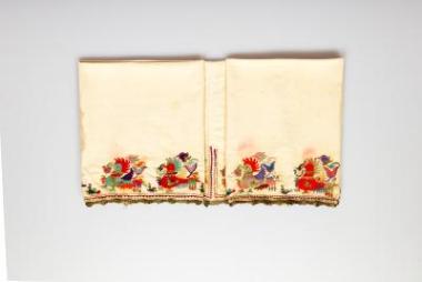 Ποδόγυρος με μεγαλύτερες φιγούρες τσαλαπετεινών και μικρότερες στο ενδιάμεσο. Το τελείωμα υπάρχει πλεκτή δαντέλα με βελόνα από χρυσόνημα.\nΒιβλιογραφία: Φαλτάιτς Μάνος Κ., Τα διακοσμητικά αντικείμενα του σκυριανού σπιτιού από ιστορική και κοινωνιολογική άποψη. Έκδοση του περιοδικού “συλλογές” σε συνεργασία με το Μουσείο Φαλτάιτς, Αθήνα 1986 (= Αρχείον Ευβοϊκών Μελετών 19 (1974), σ. 59-96). Χατζημιχάλη Αγγελική, Ελληνική Λαϊκή Τέχνη: Σκύρος. Τύποις Π. Γ. Μακρής & Σία. Αθήνα 1925. Χατζημιχάλη Αγγελική, «Μεσογειακά και Εγγύς Ανατολής κεντήματα. Τα Ελληνικά κεντήματα: Ήπειρος – Σκύρος». Byzantinisch – Neugriechische Jahrbücher, 12 (1936), σ. 97-118. Φαλτάιτς Μάνος Κ., Σκυριανή Κεντητική, Ανάτυποαπό το 27ο φύλλο των \"Βόρειων Σποράδων\", 1972.