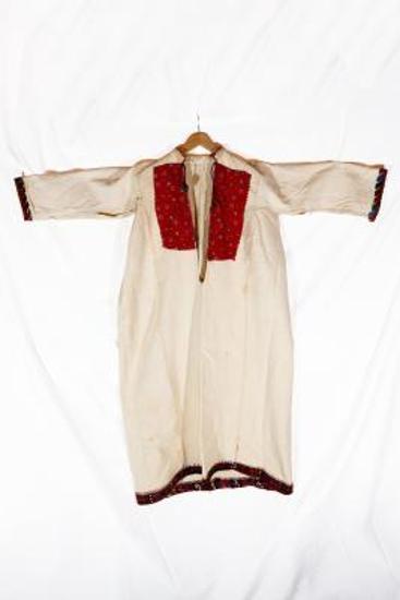 Γυναικείο μανικωτό μακρύ πουκάμισο με γιακά και βαθύ άνοιγμα μπροστά. Στις άκρες των μανικιών και τον ποδόγυρο υπάρχουν κεντημένα γεωμετρικά μοτίβα με κόκκινο γέμισμα. Στον τράχηλο υπάρχουν επίρραπτα ορθογώνια κόκκινα κομμάτια από ύφασμα για στολισμό. Ο λαιμός κλείνει με πλεκτά στο χέρι κορδονάκια που καταλήγουν σε φούντες.