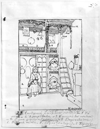 Σκίτσο της σπουδαίας λαογράφου, σκυριανής καταγωγής, Αγγελικής Χατζημιχάλης (1895-1965), από το βιβλίο «Ελληνική Λαϊκή Τέχνη – Σκύρος», που εκδόθηκε το 1925 , με αριθμημένα τα μέρη του Σκυριανού σπιτιού (EL)