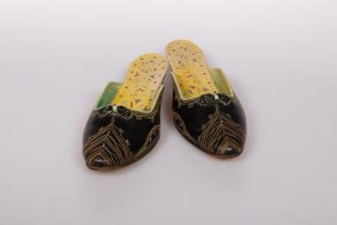 Γυναικείες παντόφλες που καταλήγουν σε τριγωνική μύτη, με ραμμένα σχέδια στο εξωτερικό του δέρματος. Στο πέλμα δερμάτινο πάτημα με διάτρητα σχέδια.\nΒιβλιογραφία: Αντζουλάτου-Ρετσίλα Ευρυδίκη, «Η φροντίδα για το σώμα του νεογέννητου παιδιού: Η περίπτωση του σκυριανού παιδικού τσεμπεριού». Αρχείον ΕυβοΪκών Μελετών, 26 (1985), σ. 125-142. - Λάμπρου Αλίκη, Οι σκυριανές φορεσιές. Έκδοση Πελοποννησιακού Λαογραφικού Ιδρύματος, Ναύπλιο 1994. - Φαλτάιτς Αναστασία, Τα σκυριανά τσεμπεράκια των συλλογών του Μουσείου Φαλτάιτς. Έκδοση του περιοδικού “συλλογές” σε συνεργασία με το Μουσείο Φαλτάιτς, Αθήνα 1985. - Φαλτάιτς Μάνος Κ., Οι Σκυριανές φορεσιές από κοινωνιολογική άποψη. Α΄ Ανδρικές φορεσιές. Έκδοση Ιστορικής και Λαογραφικής Εταιρείας Σκύρου, Αθήνα 1973.