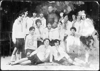 Jewish girls of Xanthi, members of the Maccabi women's sports team (1929) (In front, lying on the left, Margot Magrizou, directly above, sitting, Henriette Cohen, and to Arnette's left, Zadig Cohen)
