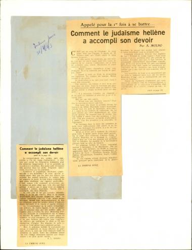 "La Tribune Juive" newspaper clippings, attached on paper, with article titled "Appelé pour la 1re fois à se battre: Comment le judaism hellène a accompli son devoir" by A.L. Molho, April 25th, 1943, attached clipping of front page title "Au Service de la Cause Alliée" of "La Tribune Juive" newspaper.