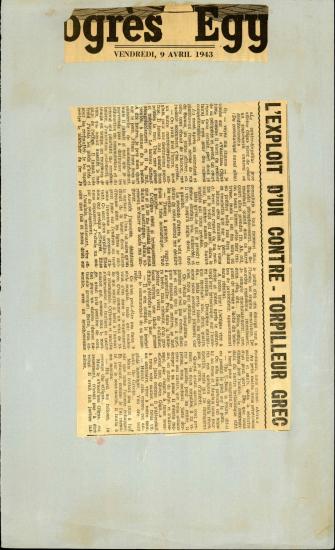 "Le Progrès Egyptien" newspaper clippings, attached on paper, with article titled "L'exploit d'un Contre - Torpilleur Grec", April 9th, 1943.