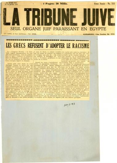 "La Tribune Juive" newspaper clippings, attached on paper, with article titled "Les Grecs Refucent d'Adopter le Racisme", March 31st, 1943, No. 333.