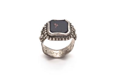 Silver ring, with bloodstone, square setting decorated with granulation.