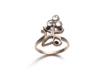 Woman's gold ring, with floral motif in openwork, set with three false diamonds.
