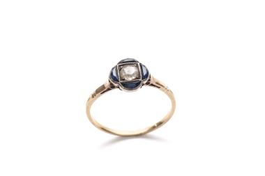 Woman's gold ring, thin hoop with openwork bezel set with diamond in square silver mounting flanked on four sides with petal-shaped dark blue stones in silver bezel setting.