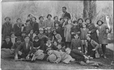 Commemorative photo of the Primary School of the Israeli School of Serres. The gymnast Mr. Kahrimanidis, the sister of the donor Mr. Dorranis (sitting in the center with the bow) and a Jewish classmate of theirs, Chaim Matalon (with the ball) can be seen.
