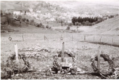 Φωτογραφία που εικονίζει τον Τόπο της Εκτέλεσης στα Καλάβρυτα, στο βάθος φαίνεται η κατεστραμμένη πόλη των Καλαβρύτων. (EL)