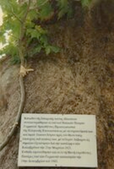 Η επιγραφή στον ιστορικό πλάτανο στην είσοδο της Μονής της Αγίας Λαύρας η οποία αναφέρεται στον όρκο των πρωταγωνιστών της Ελληνικής Επανάστασης στον Παλαιών Πατρών Γερμανό στις 21-03-1821 και στην καταστροφή και εκτέλεση των μοναχών στις 14-12-1943 από τις Γερμανικές Δυνάμεις Κατοχής.