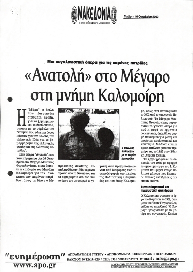 Δημοσίευμα στην εφημερίδα " ΜΑΚΕΔΟΝΙΑ" με τίτλο "«Ανατολή» στο Μέγαρο στη μνήμη Καλομοίρη"